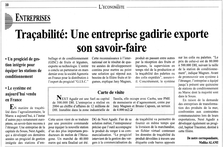 En matière de traçabilité dans l’agroalimentaire, le Maroc a aujourd’hui, à l’instar d’autres pays notamment européens, un savoir-faire reconnu à l’étranger. Une entreprise de la capitale du Souss, NeXT AGADIR, qui a développé ces dernières années un progiciel de gestion intégrée des stations d’emballage et de conditionnement (GISC) de fruits et légumes, exporte sa technologie. L’entité a conclu un partenariat en mars dernier avec la société Agenoria en France pour la distribution à l’export du progiciel “G.I.S.C.” Cette union vient de se traduire par une première commande pour équiper la nouvelle station d’un des plus importants producteurs de melon de l’Hexagone. Un marché de 40.000 euros qui sera finalisé cet été. Cette reconnaissance à l’international est le résultat de quatre années de développement continu pour mettre au point une solution qui répond aux besoins de la filière fruits et légumes, explique Jany MAGNEN, DG de NeXT AGADIR. Fier de sa solution métier, l’entrepreneur précise que l’outil accompagne le produit du verger à sa commercialisation. “Le progiciel intervient de la gestion des vergers à la commercialisation du produit en passant entre autres par la réception des fruits et légumes, la supervision en temps réel de la production et la traçabilité des palettes ou des colis expédiés”, assure-t-il. Concrètement, le système de traçabilité va permettre de fournir en même temps que la livraison de la marchandise, un fichier virtuel contenant les données de traçabilité du produit dévoilées à travers une étiquette code barres apposée sur les colis ou palettes. “Le prix de celui-ci est de 80.000 à 500.000 DH, suivant la taille de la station de conditionnement”, indique Jany MAGNEN. Avant de promouvoir son système à l’étranger, l’entreprise a équipé jusqu’à présent une quinzaine de stations de conditionnement au Maroc dont la majorité sont dans le Souss.